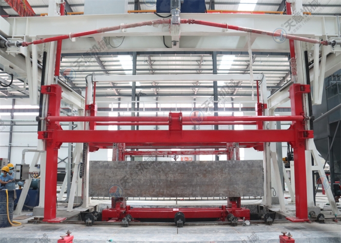 當(dāng)砌塊的強度達到可進行切割時, 加氣混凝土便開始脫模。脫模后的砌塊被運送到切割線上。在切割線上, 加氣混凝土先經(jīng)過校準 、整形, 而后進行縱向切割和橫向切割。  榫口、凹槽和手持孔的切割在坯體進行蒸壓前處理完成,這樣就無需摩削硬化后的 加氣混凝土成品了,從而節(jié)約成產(chǎn)成本,這也是我們“零工藝廢料”概念的一部分。