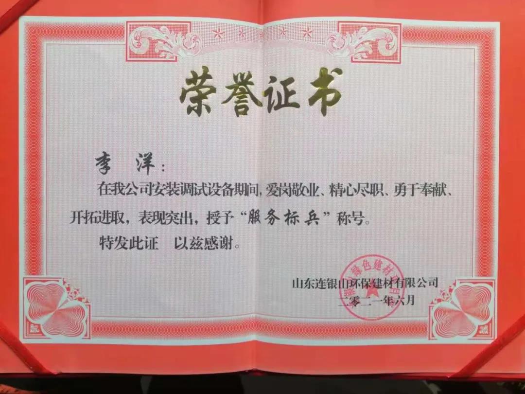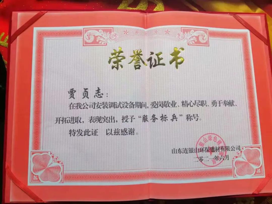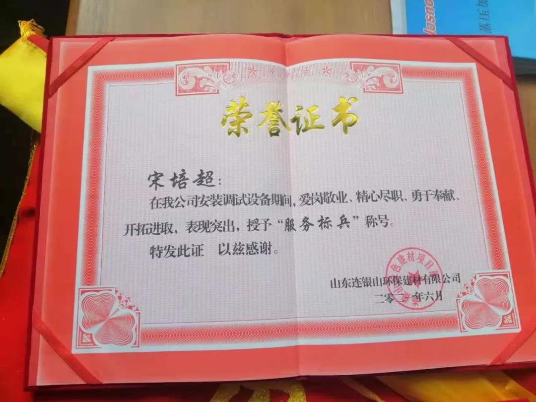 炎炎夏日,天意機(jī)械在向客戶山東連銀山環(huán)保建材有限公司售出保溫裝飾一體化板生產(chǎn)線之后,隨即派出售后團(tuán)隊(duì)對(duì)設(shè)備進(jìn)行安裝調(diào)試及售后培訓(xùn)。售后團(tuán)隊(duì)不畏酷暑,精心、耐心、專業(yè)地為客戶進(jìn)行安裝調(diào)試,贏得了客戶的好評(píng)和認(rèn)可,客戶為表達(dá)謝意,特授予天意機(jī)械售后人員榮譽(yù)證書(shū)和錦旗,以表彰售后人員愛(ài)崗敬業(yè)、精心盡職、勇于奉獻(xiàn)、開(kāi)拓進(jìn)取的精神。