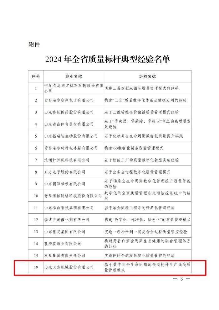 7月,山東省工業(yè)和信息化廳公布了全省質(zhì)量標(biāo)桿獎(jiǎng)。天意機(jī)械憑借在關(guān)鍵過(guò)程質(zhì)量控制方向的不懈探索,以基于數(shù)字化全生命周期的預(yù)制構(gòu)件生產(chǎn)線高質(zhì)量管理模式斬獲“2024年全省質(zhì)量標(biāo)桿”。